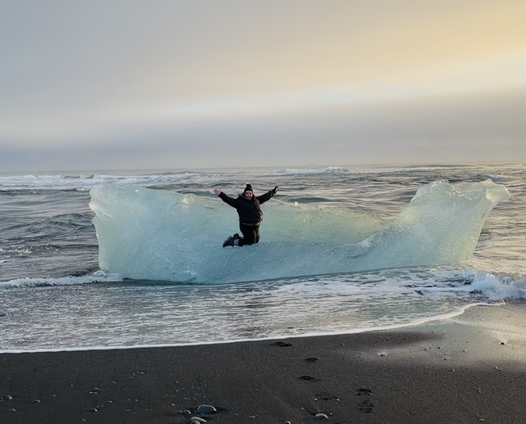 And still—when our guide’s attention drifted for a moment—Ruby, a woman in our group, asked her friend to film her. She waited for the split-second when the water pulled back, then darted forward and jumped onto a wave-washed ice chunk, striking a victorious pose. For that brief moment, it felt like the entire beach held its breath.