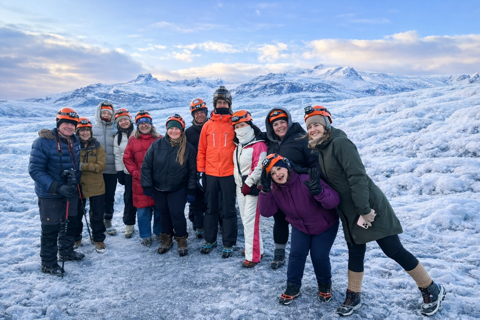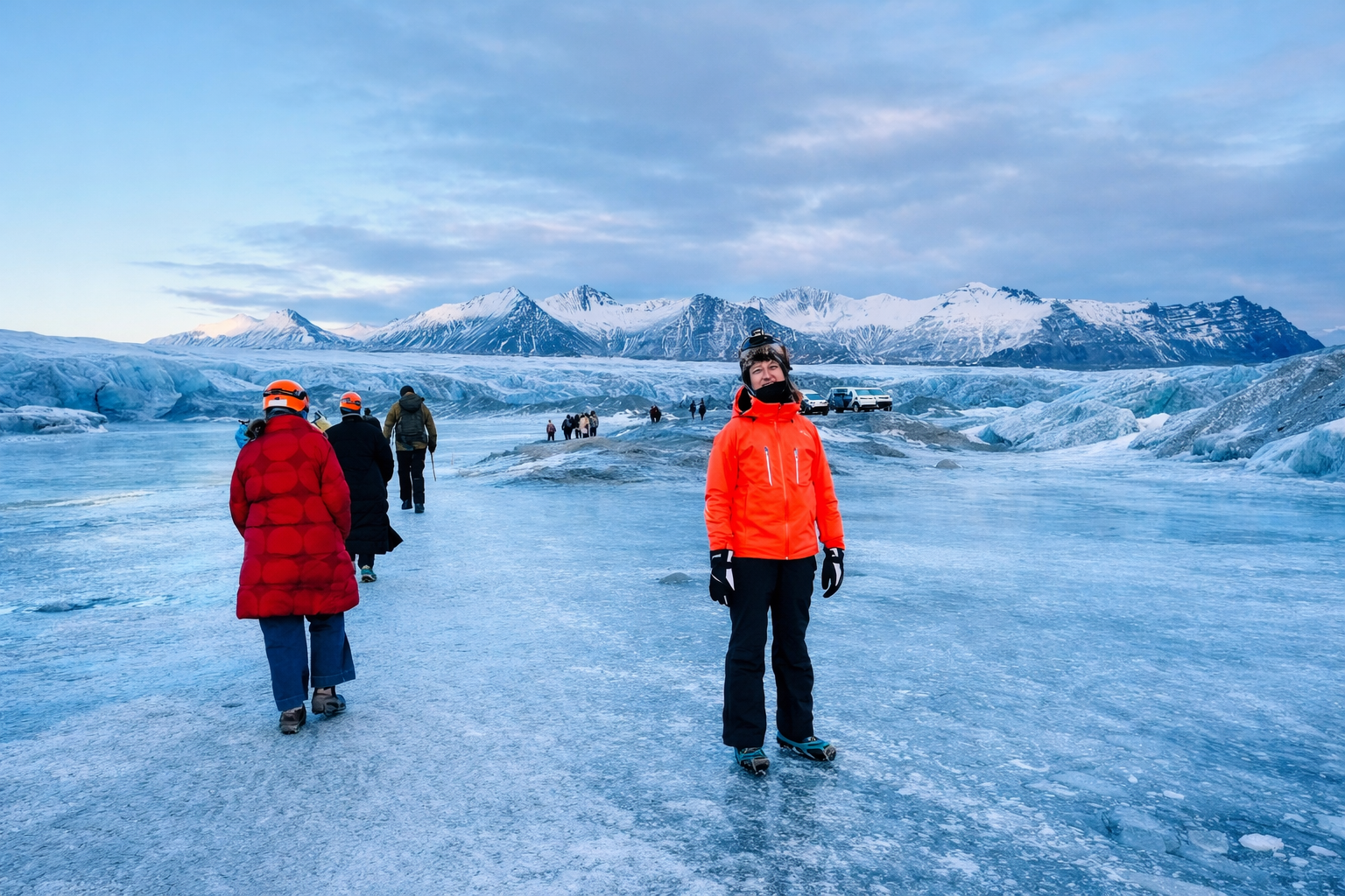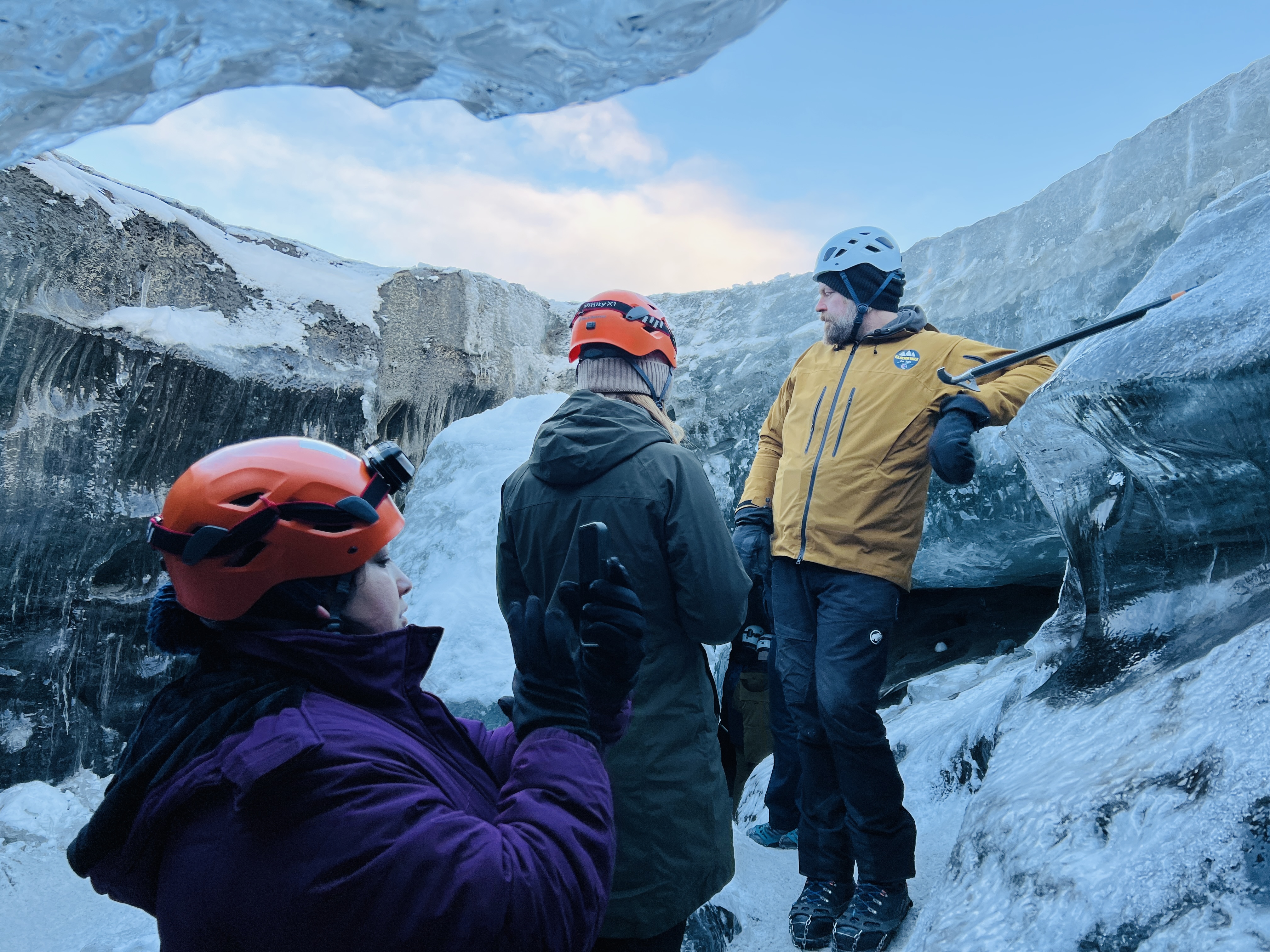 차에서 내리자 가이드는 헬멧을 나눠주고, 신발 위에 아이젠을 채워 주었다. 드디어 빙하 동굴로 들어갈 준비가 끝났다고 생각했는데, 뜻밖의 변수가 생겼다. 아이슬란드에서 산 멋진 털모자가 너무 두꺼워 헬멧이 제대로 들어가지 않았던 것이다.