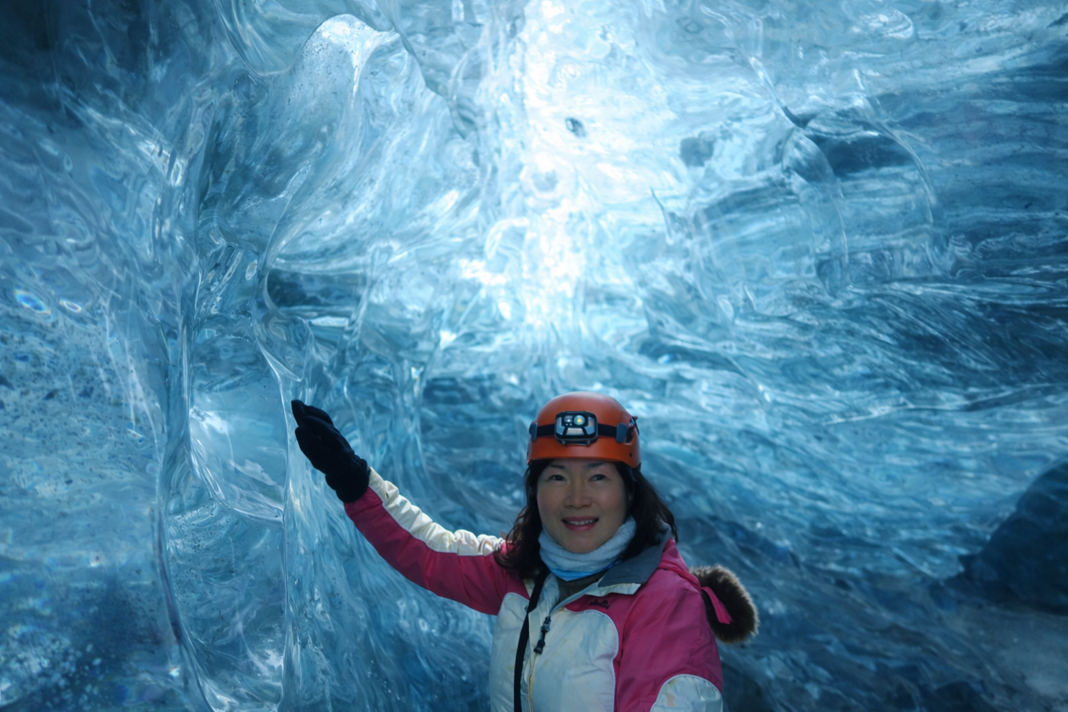 기념사진을 남기는 빙하 동굴 속 탐험자들 블루 크리스탈 동굴을 걷는 내내 머리가 몹시 시렸고, 이상하게도 그날의 냉기는 오래 남아 한 달이 지난 지금도 가끔 머리끝이 얼어 있는 듯한 느낌이 든다. 빙하 동굴 내부는 생각보다 좁아 몇 번이나 머리를 벽에 부딪혔다. 그래서 가이드가 털모자를 포기하더라도 헬멧을 반드시 착용하라고 했나 보다. 만약 털모자만 쓰고 들어갔더라면, 정말로 다칠 뻔했겠다.