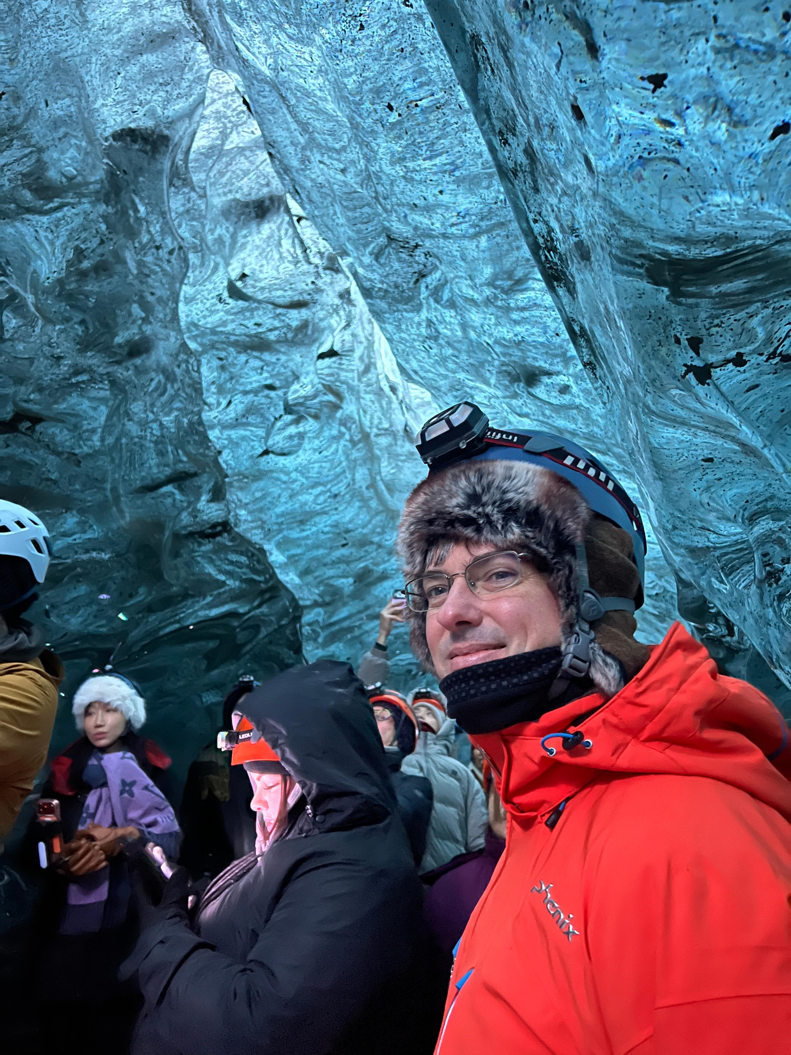 빙하 동굴 탐험을 앞두고, 빙하 위를 걸으며 남긴 기념사진. 매서운 추위 속에서 털모자를 벗고 플라스틱 헬멧만 쓰고 있으니 머리가 얼어붙는 듯했다. 게다가 요쿨살론 빙하호수에서 장갑 한 짝을 잃어버렸나 보다. 오른손이 금세 감각을 잃어갔다. 이러다 동상에 걸리는 게 아닌가 하는 불안이 엄습해왔다.