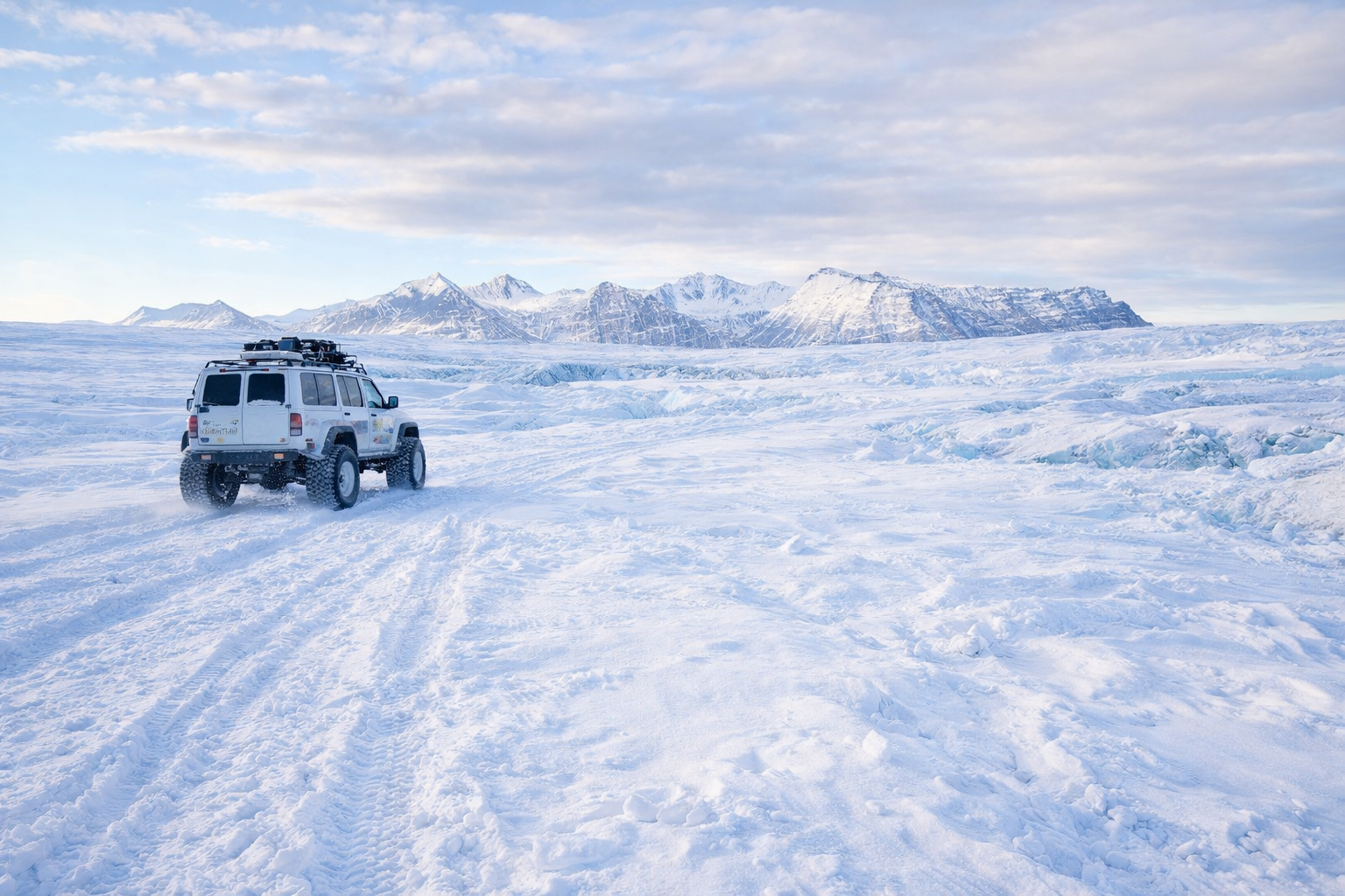 The Super Jeep we rode in, carrying us across the glacier to the Blue Crystal Ice Cave. After spending some time at Jökulsárlón Glacier Lagoon, we climbed into a Super Jeep and drove for a long while across terrain mixed with ice, gravel, and snow. The very concept of a “road” had already disappeared. All that remained was a trace-like path leading toward the Blue Crystal Ice Cave.