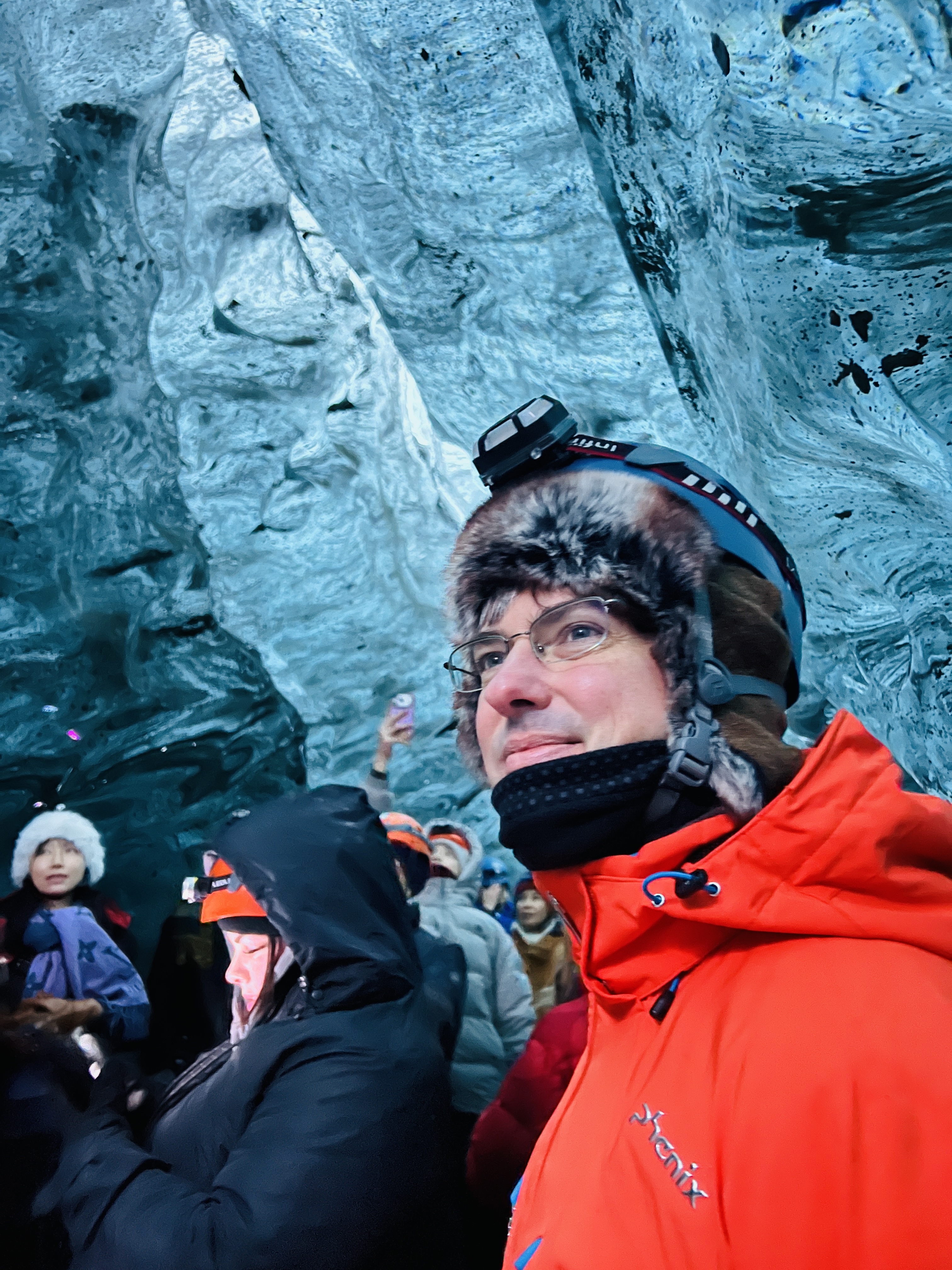 Explorers inside the glacier cave, pausing for a commemorative photo. My head stayed painfully cold throughout the Crystal Cave, and strangely, that chill has lingered—so much that even now, a month later, I sometimes feel as if the tips of my hair are still frozen.