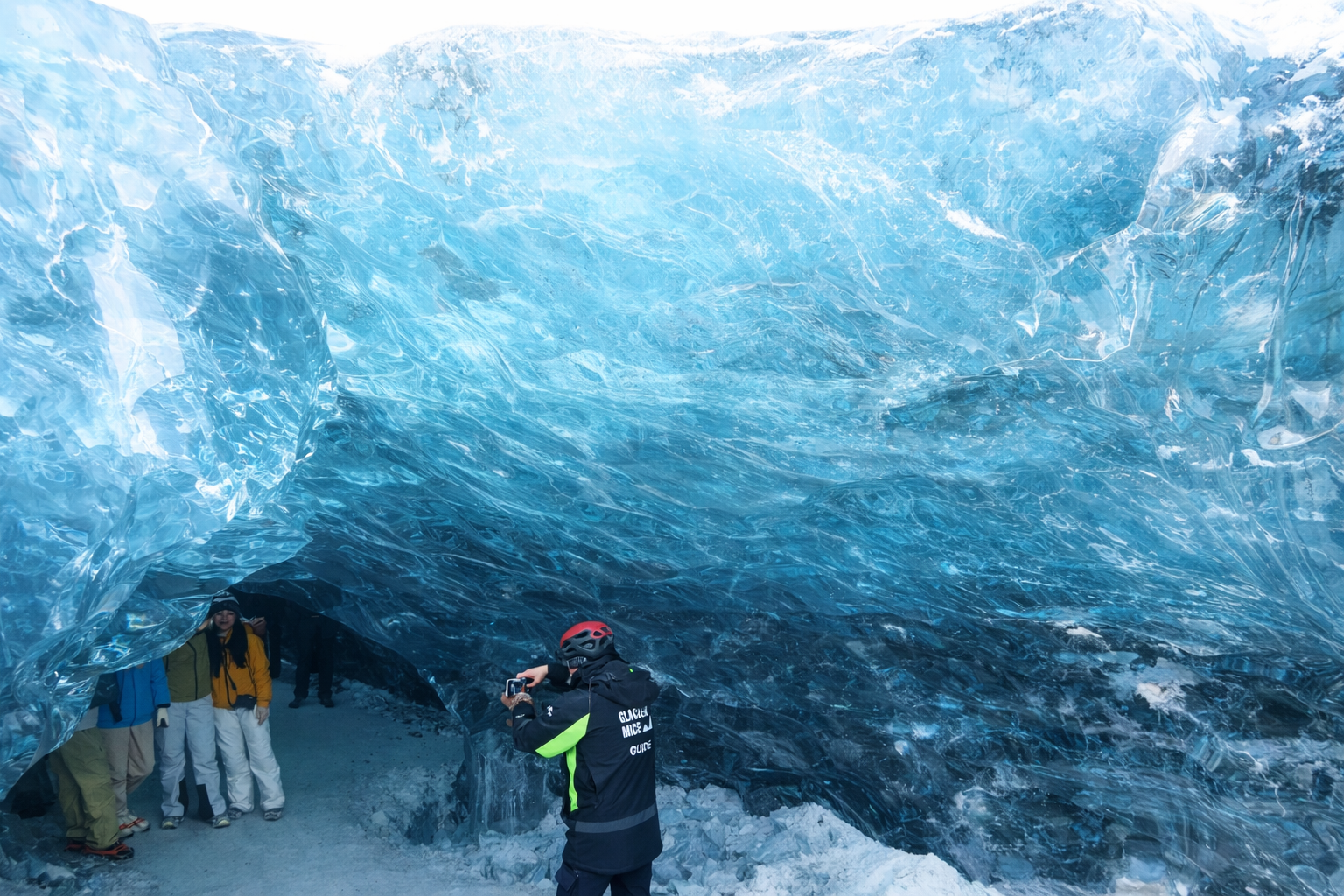 As we walked across the glacier in helmets, we looked like an expedition team. After a long trek, the entrance appeared—an opening descending beneath the glacier.