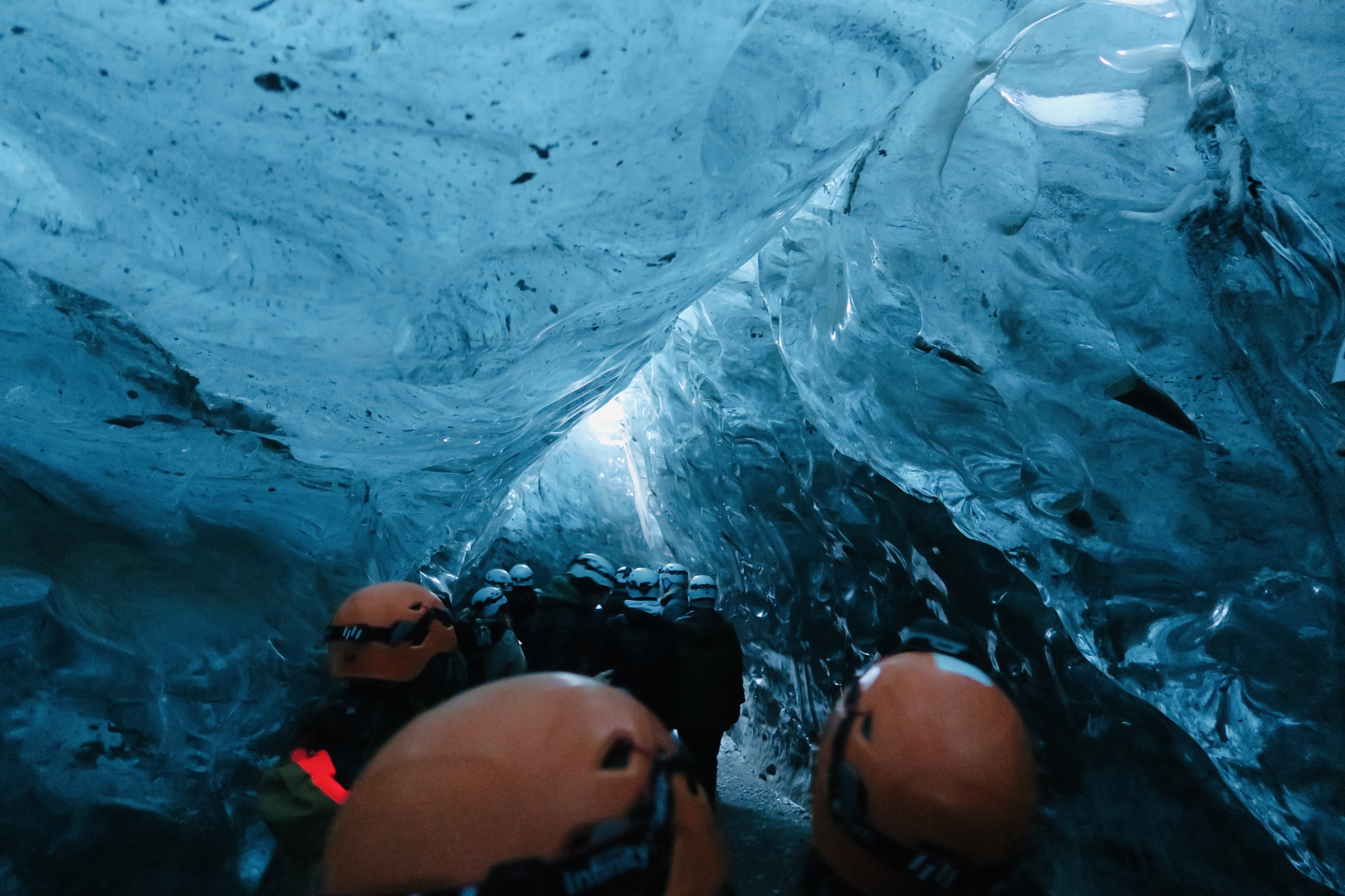 A moment that felt like stepping into a transparent blue sapphire. Inside the glacier cave, the space was narrower than I expected, and I bumped my head against the icy walls several times. That must be why the guide insisted we wear helmets, even if it meant giving up a warm hat. If I had gone in with only my wool hat, I could easily have gotten hurt.