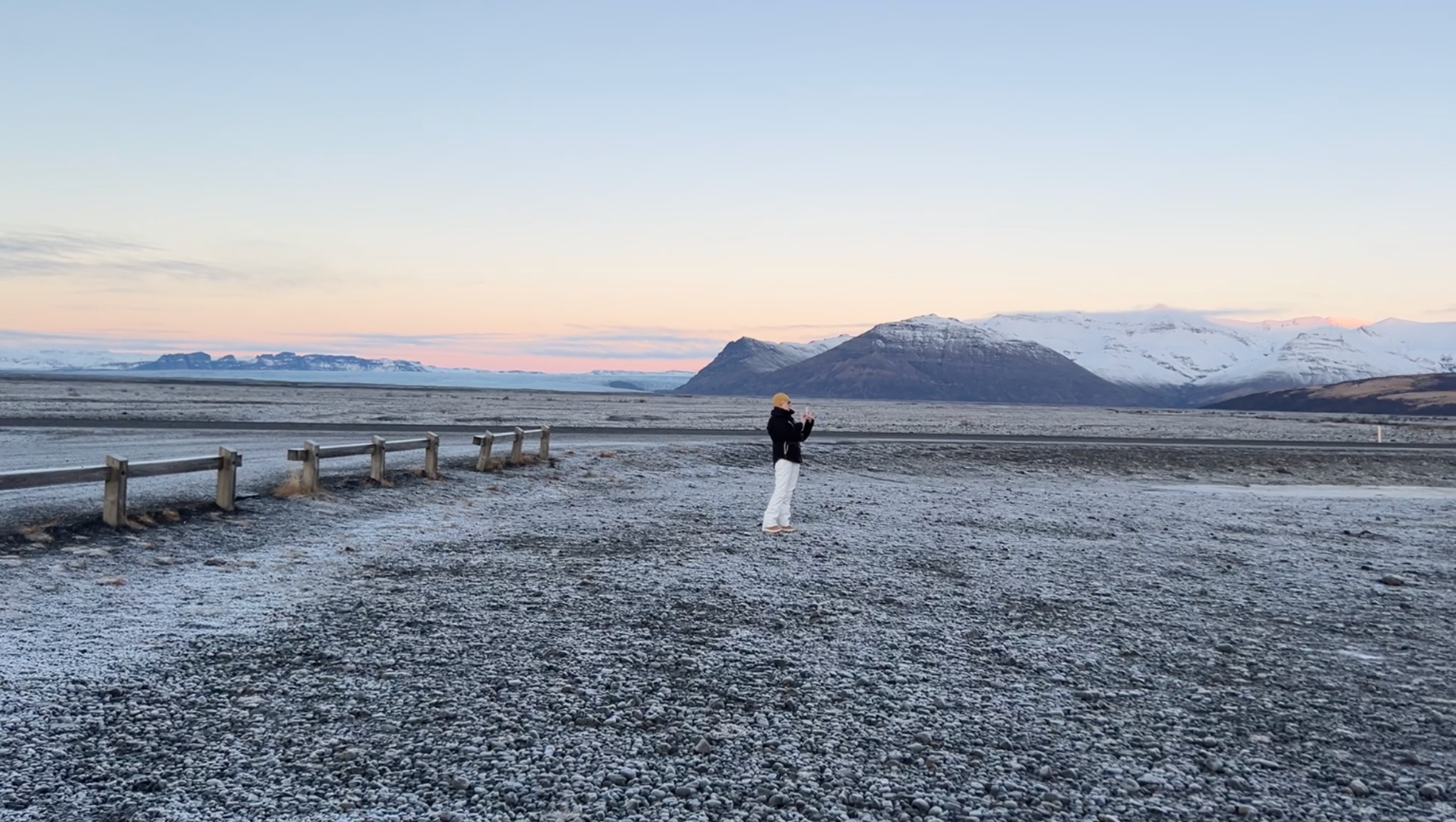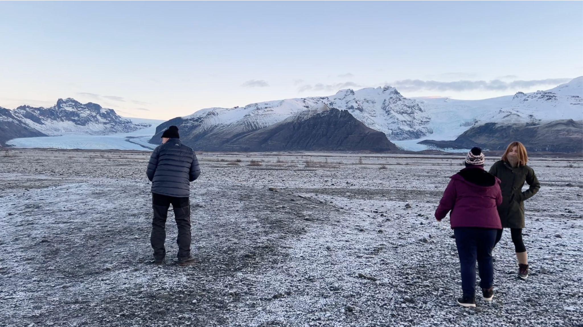 In Skaftafell, someone pauses to record the landscape. Under the early-morning light, the scene carried a pastel calm, like the last trace of dawn. As the sun rose low, the details on the ice surface became clearer—fine textures and edges quietly emerging. In that soft midwinter morning, Iceland’s signature “luminous blue” felt at its most visible and most alive.